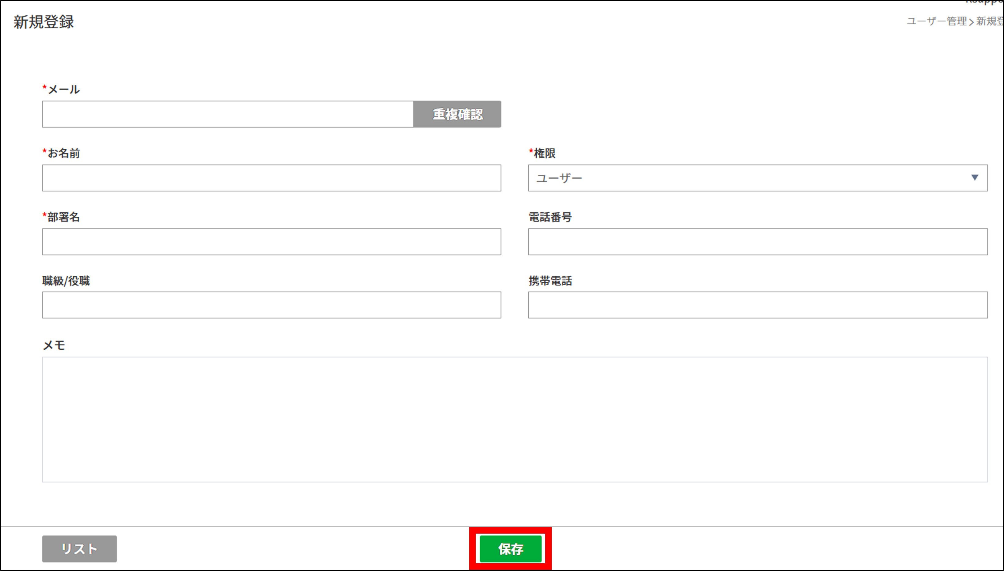 2.追加するメンバーの「メールアドレス」「お名前」などの必要情報を入力し、「保存」をクリックします。