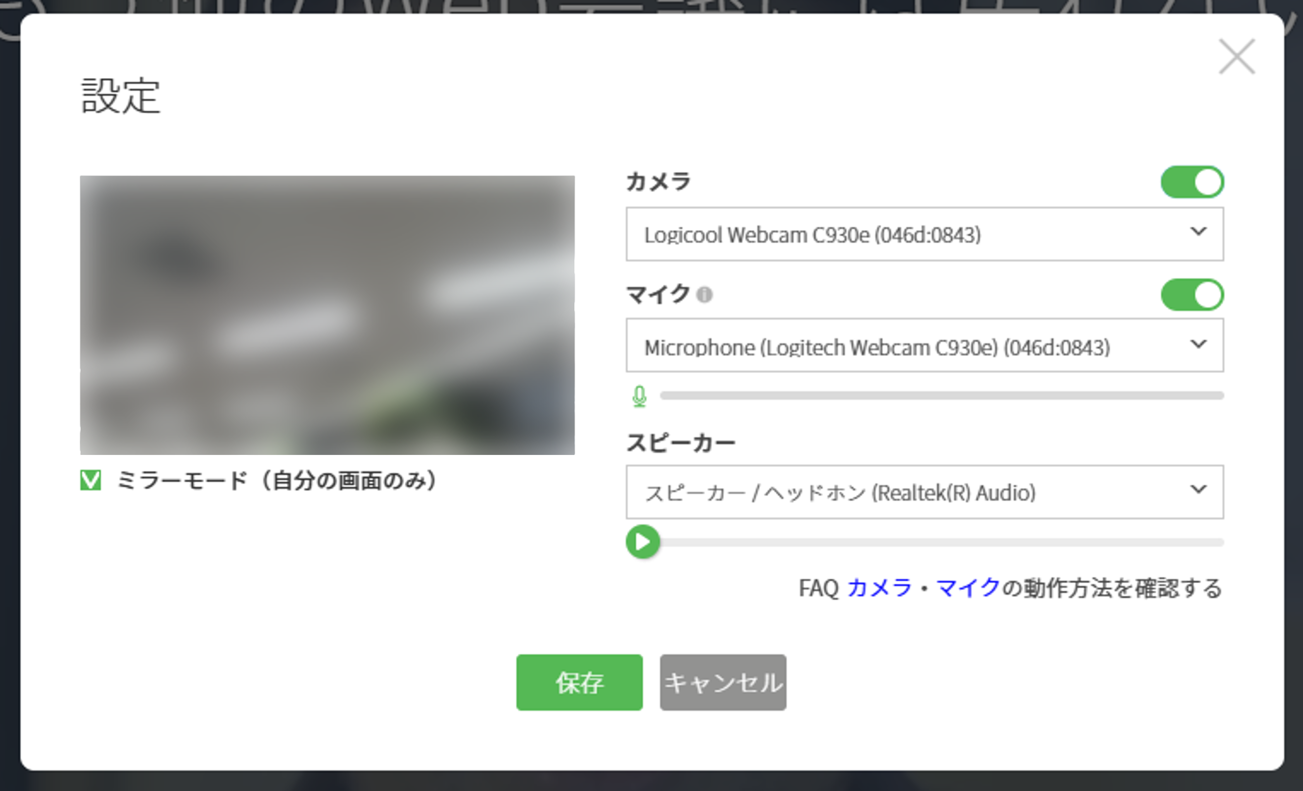 ・カメラ・マイクの選択:複数の機器を接続している場合、リストから使用したいデバイスを選択できます。